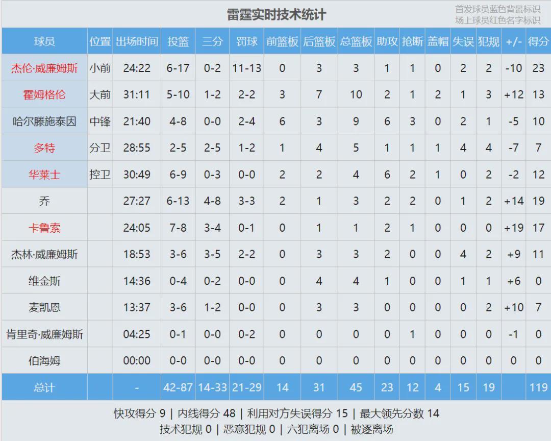 全场结束,湖人110-119不敌雷霆,明天湖人背靠背对阵西部第二的马刺。里夫斯首节4中4,后三节8中2,全场14中6砍下16分2篮板7助攻5失误。詹姆斯17中9,得到22分6篮板10助攻3失误。杰威得到23分,以赛亚-乔砍下19分。
