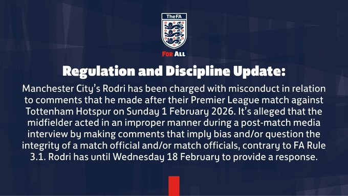 官方:罗德里因为对热刺赛后质疑裁判的公正性被英足总指控