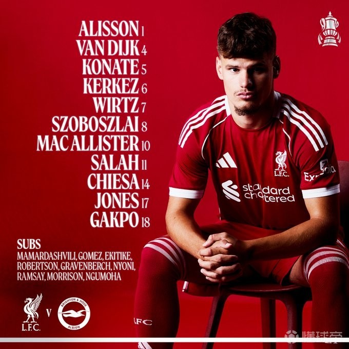 利物浦首发:1-阿利松、8-索博斯洛伊、4-范戴克、5-科纳特、6-凯尔凯兹、17-柯蒂斯-琼斯、7-维尔茨、10-麦卡利斯特、11-萨拉赫、14-费代里科-基耶萨、18-加克波