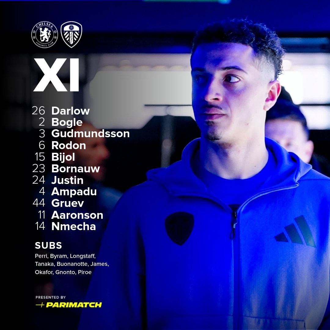 利兹联首发:26-达洛、24-贾斯廷、15-比约尔、6-罗顿、3-古德蒙松、23-博尔顿、44-格鲁耶夫、4-阿姆帕杜、2-博格尔、14-恩梅加、11-阿伦森