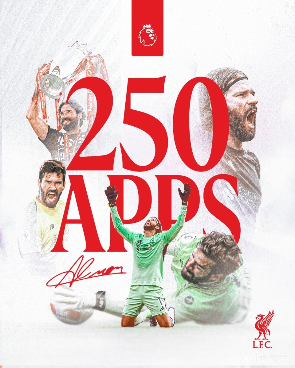 此役客场对阵桑德兰,阿利松首发出战,这位巴西门将迎来英超生涯第250次出场,全部是代表利物浦出战。