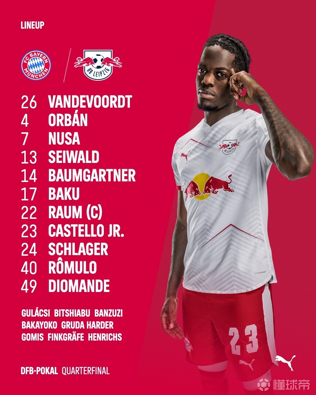 莱比锡首发:26-范德沃特、17-巴库、4-奥尔班、23-卢克巴、22-劳姆、24-施拉格尔、13-赛瓦尔德、14-鲍姆加特纳、49-扬-迪奥曼德、40-罗慕洛、7-努萨